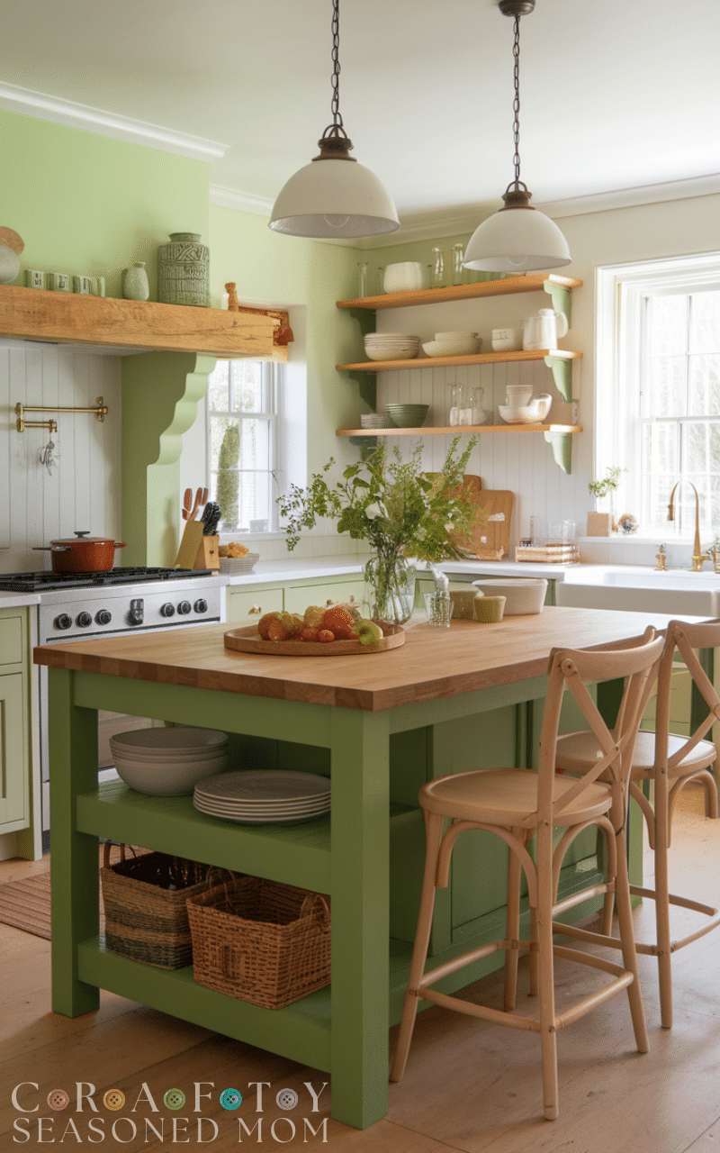 Adding a cottage style green island is a great way to enrich Green Cottage Kitchen Designs because it creates a cozy centerpiece that is functional and charming at the same time and pairing the island with a warm wood countertop makes the space feel more natural and welcoming and the combination of green paint and natural wood brings harmony and softness that fits perfectly with the cottage look and the island can be used for prep dining or storage which means it adds beauty and practicality and the warm wood also helps soften the boldness of the green color and creates a balanced feel that makes the kitchen lively yet peaceful and that is why this idea works so well in Green Cottage Kitchen Designs.