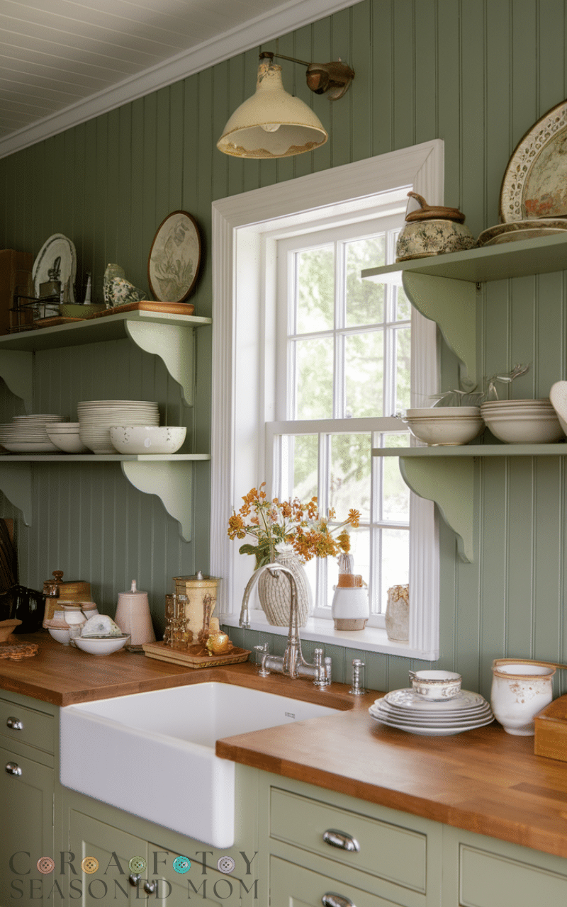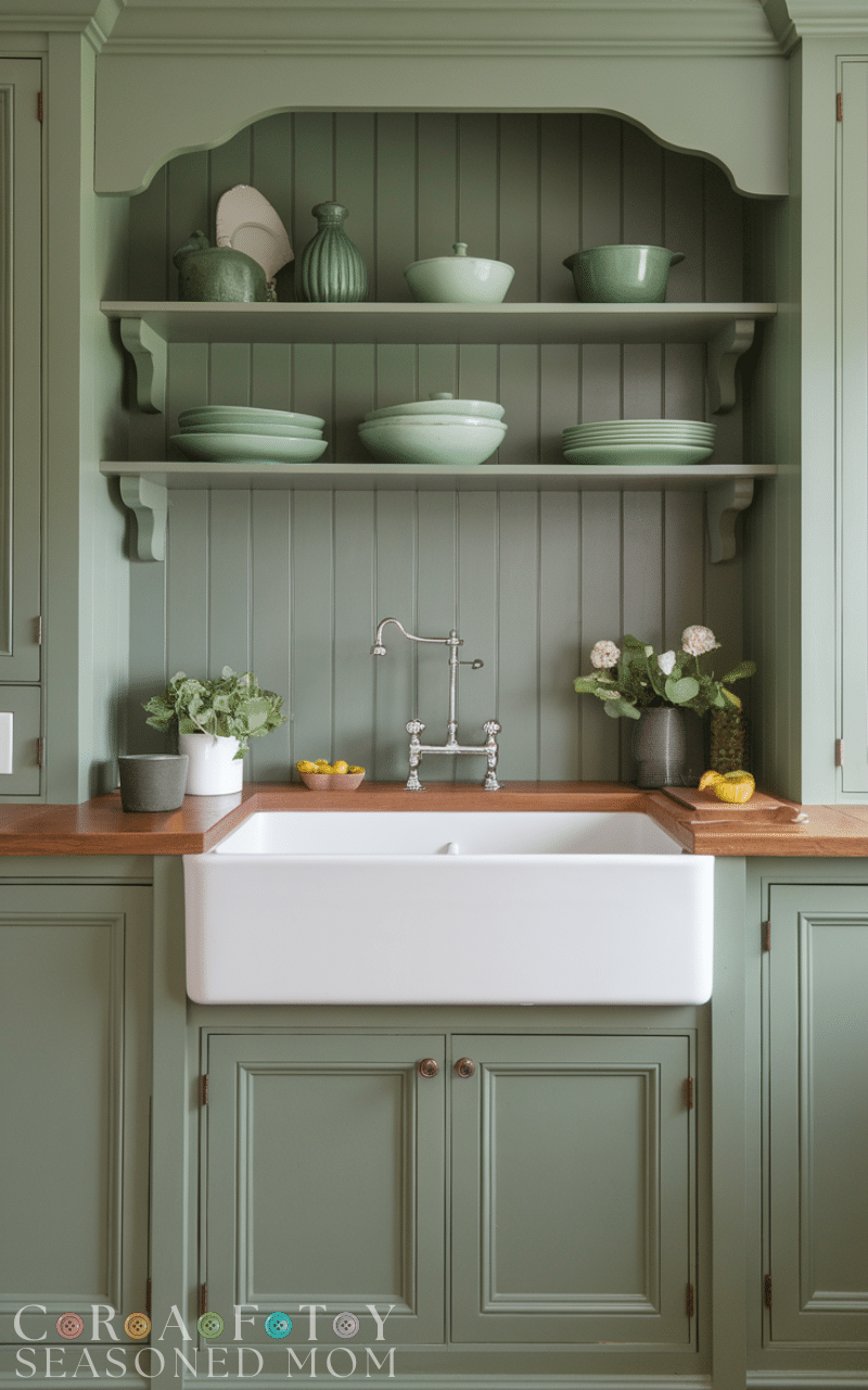 Beadboard backsplashes are a timeless cottage feature and painting them green makes them even more charming in Green Cottage Kitchen Designs because they introduce texture and character without overwhelming the space and beadboard offers a soft vertical pattern that makes the kitchen look taller and more structured and when painted green it brings a gentle earthy warmth that feels both peaceful and inviting and this kind of backsplash works beautifully with wood countertops white dishes or vintage decor which makes it easy to style and maintain and these details come together to create one of the sweetest and most classic touches you can add to your Green Cottage Kitchen Designs.