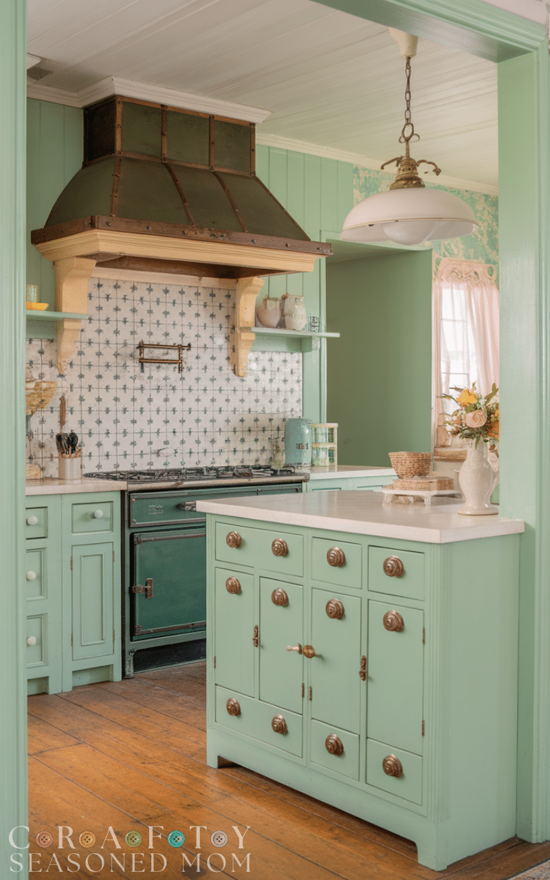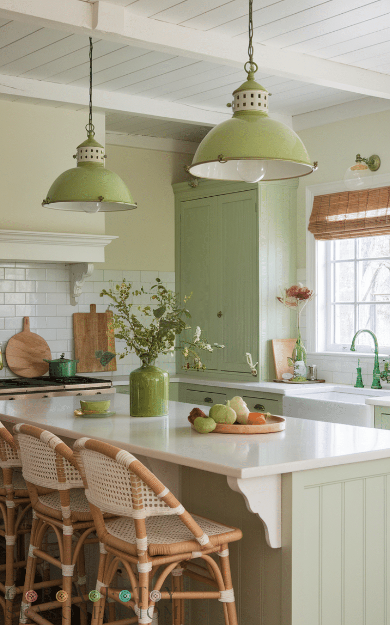 Lighting fixtures are an important part of Green Cottage Kitchen Designs because they can completely change the mood of the room and choosing soft green fixtures or fixtures with green details can bring cohesion and charm to the whole kitchen and these lights add a gentle glow that makes the space feel warm and welcoming and they also bring a lovely decorative touch without being overpowering and the soft green color helps connect all the other design elements and makes everything feel naturally tied together and this idea works whether your style is vintage rustic or modern cottage which is why it is a perfect fit for Green Cottage Kitchen Designs.