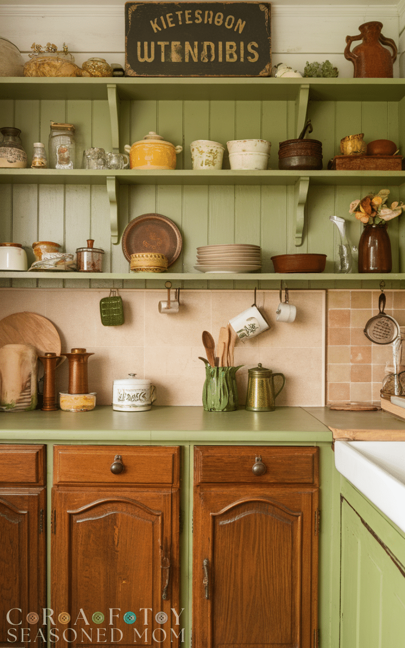 Vintage decor is a perfect match for Green Cottage Kitchen Designs because it brings nostalgia character and charm to the space and adding items like old jars classic signs wooden utensils or antique dishes creates a warm lived in feeling that fits the cottage style beautifully and the green color in the kitchen enhances these vintage pieces even more because it adds softness and warmth that ties everything together and this style allows you to express your personality while keeping the kitchen cozy and welcoming which makes it one of the most delightful ways to decorate Green Cottage Kitchen Designs.