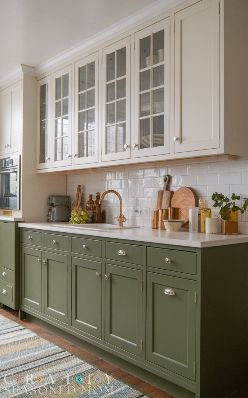 Two tone cabinets are a modern take on the cottage style and using green on the bottom cabinets creates a grounded warm effect that works beautifully in Green Cottage Kitchen Designs and pairing the green lower cabinets with soft white upper cabinets helps the kitchen feel brighter while keeping the cozy cottage charm and this design adds visual balance because the green tone keeps the space earthy and welcoming while the white upper cabinets keep it light and open and this approach also allows you to enjoy the natural calm of green while still keeping the overall kitchen bright which is why it is a popular choice in Green Cottage Kitchen Designs.