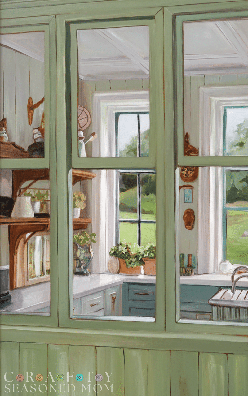 Painting window frames in soft green shades is an easy way to elevate Green Cottage Kitchen Designs because it brings instant charm and creates a natural focal point that brightens the room and the green frames draw attention to the outdoor view and help bring the nature feeling indoors which is perfect for the cottage aesthetic and this touch is subtle yet powerful because it adds color in a clean and refreshing way that does not overwhelm the kitchen and it works wonderfully with white walls wood accents or vintage decor which makes it a flexible choice and a lovely detail in any Green Cottage Kitchen Designs.