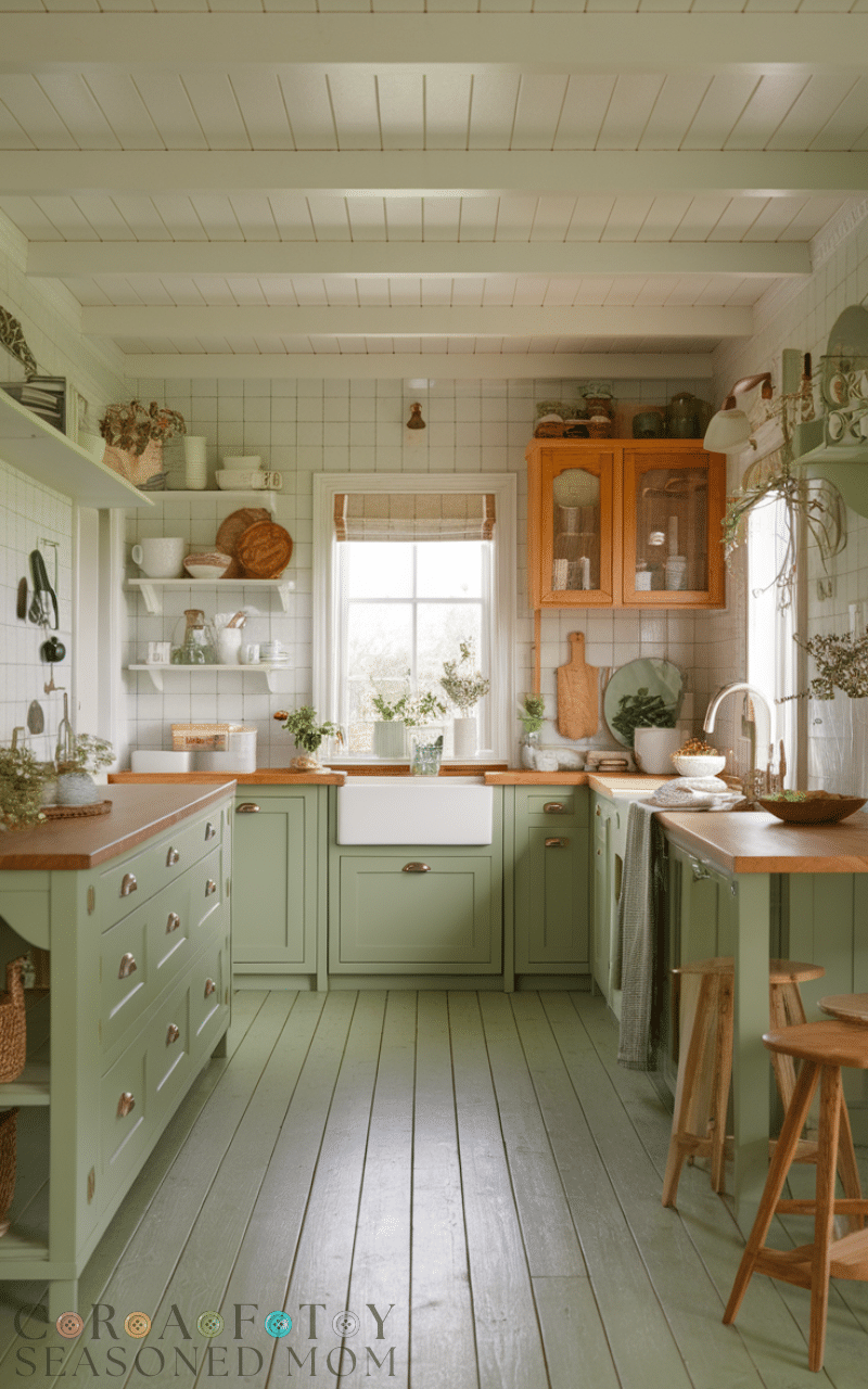 Flooring plays a key role in Green Cottage Kitchen Designs because it sets the tone for the entire space and choosing flooring with green tones or natural textures like wood or stone helps create a peaceful and earthy atmosphere and these materials make the kitchen feel connected to nature and add the cottage warmth that everyone loves and soft green tones in flooring bring gentle color underfoot while keeping the atmosphere light and calming and this combination supports the relaxed and cozy feeling that defines Green Cottage Kitchen Designs and it works beautifully with different styles and sizes of kitchens.