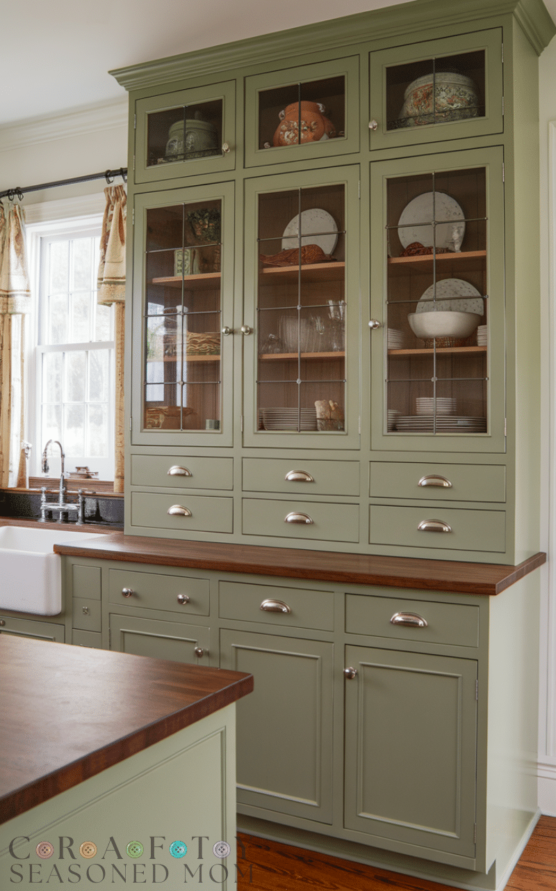 Cabinets with glass front doors add classic charm to Green Cottage Kitchen Designs because they create a soft open look that allows the kitchen to feel bright and friendly and painting the cabinetry green gives it a calm natural vibe that suits the cottage style beautifully and the glass doors help display dishes and decor in a gentle and inviting way which adds personality without making the space feel crowded and this combination makes your kitchen feel airy because the transparency of the glass blends smoothly with the restful green color and it also adds a delicate balance between elegance and simplicity which is why this idea is a favorite in Green Cottage Kitchen Designs.