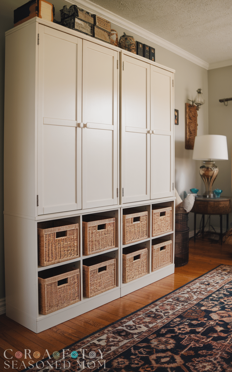 Transforming a simple KALLAX unit into a custom built-in wall system is one of the smartest ikea hacks for organization for bedrooms, offices, or living rooms. By adding trim, molding, and matching paint, you can make budget furniture look high-end while gaining massive hidden storage. Baskets, drawers, and inserts help separate books, clothes, and accessories neatly, preventing clutter from piling up. This ikea hacks for organization idea works especially well in small apartments where built-ins are expensive, because you get the same polished look for a fraction of the price. With a little creativity, lighting, and matching décor, your KALLAX can feel custom, stylish, and perfectly organized instead of basic or temporary.