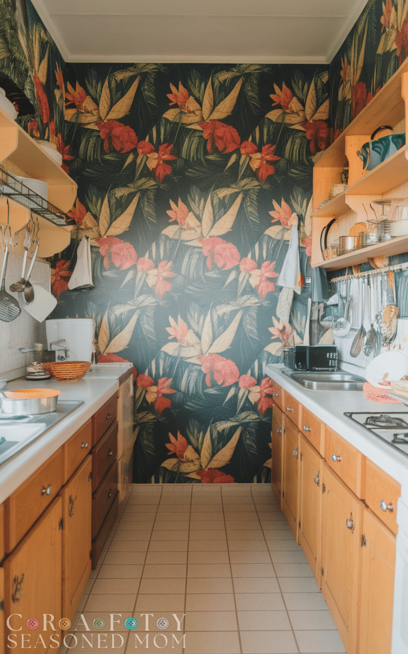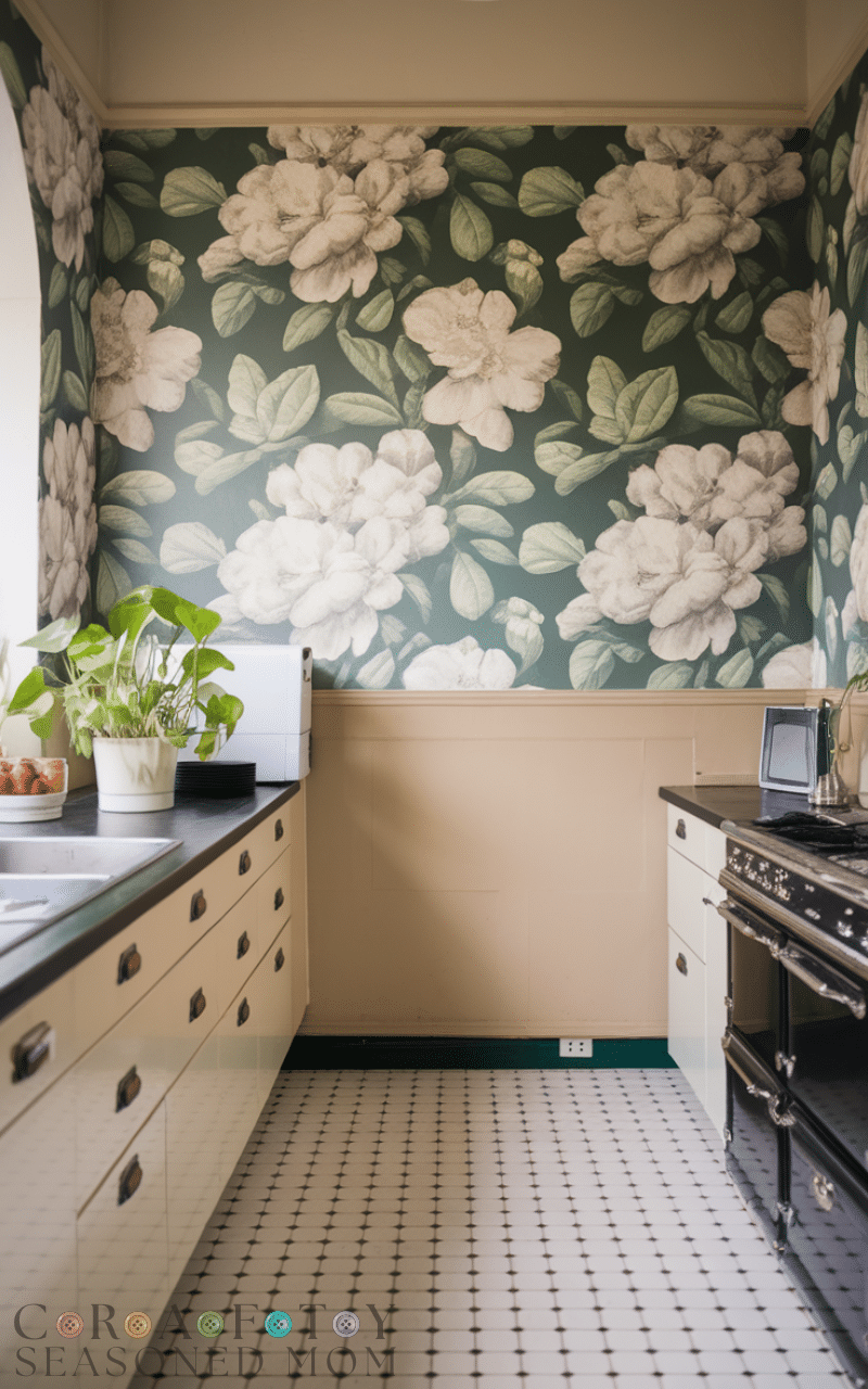 Floral wallpaper brings a fresh, cheerful energy. I adore large blooms for drama and tiny flowers for subtle charm. Florals work in both vintage and modern kitchens, creating a warm and inviting atmosphere. Mixing patterns can even add a playful touch, making your kitchen feel lively and welcoming.