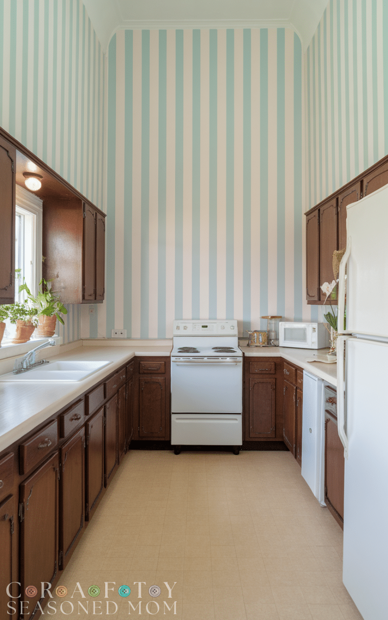 Stripes are timeless. Vertical stripes can make your walls feel taller, while horizontal stripes give a wider look. I like soft pastel stripes for calm mornings and bold contrasting stripes when I want a dramatic touch. Striped kitchen wallpaper works beautifully with cabinets and countertops, giving your space a structured and polished vibe.