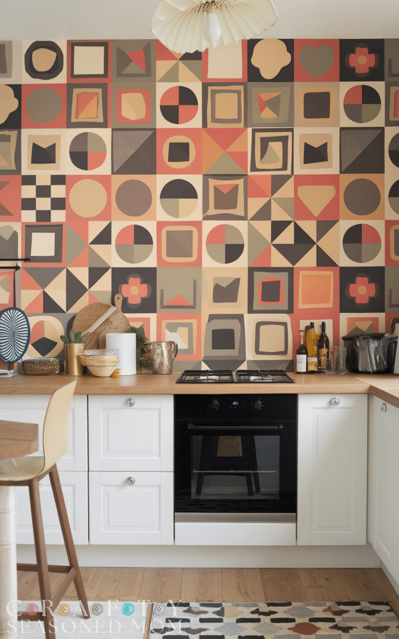Bold geometric patterns are great for adding energy to your kitchen. I love mixing different shapes and colors—it instantly livens up the room. Geometric designs also help define areas in an open kitchen and pair well with both modern and traditional styles. Whether you choose bright tones for a cheerful feel or muted shades for elegance, this wallpaper transforms your kitchen effortlessly.