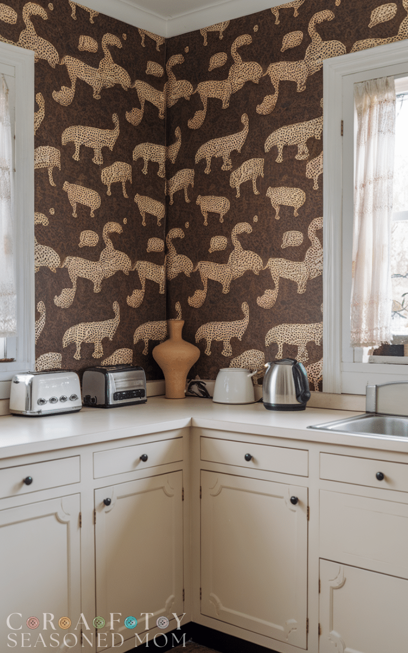 Animal prints in kitchen wallpaper add personality and boldness and you can choose patterns like leopard, zebra, or birds and animal print kitchen wallpaper makes the kitchen unique and playful and it works well for accent walls or small areas and it adds texture and interest to your space and the best part is that animal print kitchen wallpaper gives a fun and lively touch while allowing you to show off a creative style in your kitchen.