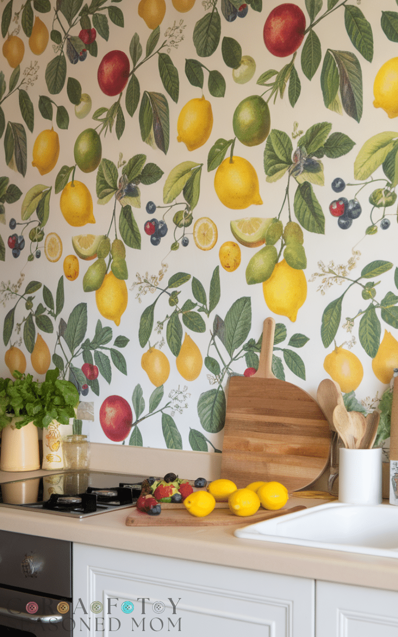 Fruit and vegetable prints on kitchen wallpaper make the space fun and food-inspired and you can choose lemons, berries, or herbs and fruit and vegetable kitchen wallpaper brightens the room and gives a fresh and healthy vibe and it is perfect for kitchens where you want to highlight cooking and natural ingredients and the best part is that fruit and vegetable kitchen wallpaper adds playful charm and inspires creativity while preparing meals and makes the kitchen lively and inviting.