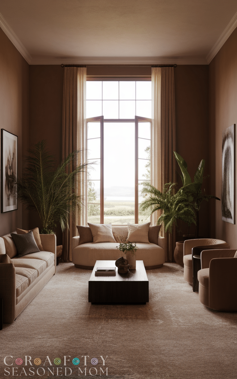 Warm taupe is a sophisticated choice among living room paint colors, offering depth without darkening the room too much. This shade blends brown and gray tones, creating a rich yet neutral background. Taupe works beautifully with both light and dark furniture and adds a touch of luxury to the living room. It’s ideal if you want a polished and cozy space that still feels modern.