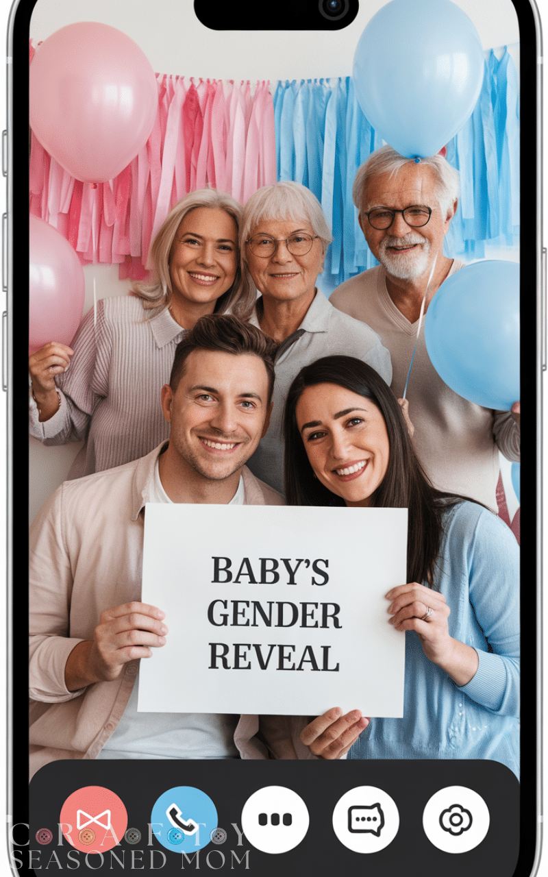 Ask family members to wear neutral colors, then you appear on screen wearing pink or blue. This long distance gender reveal idea is simple, fun, and perfect for photos and screenshots you’ll cherish forever.