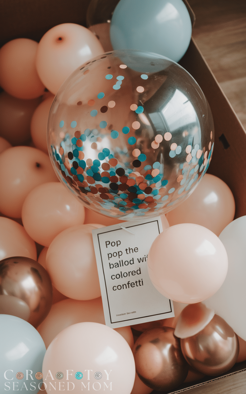 Send a box with instructions to pop a balloon filled with colored confetti. This long distance gender reveal idea is interactive and exciting, especially when done together over a video call.