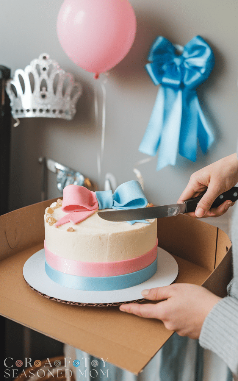 Arrange for a local bakery to deliver a cake to your loved ones. This long distance gender reveal idea lets them cut into the cake to discover the color inside, creating a shared moment despite the distance.