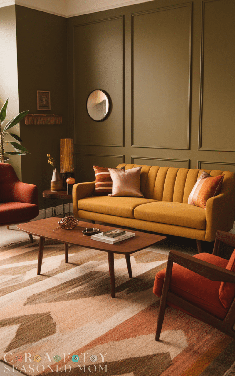 Olive green, mustard yellow, rust, and warm neutrals are classic choices for mid century modern living rooms. These colors add depth and personality while remaining calm and balanced.