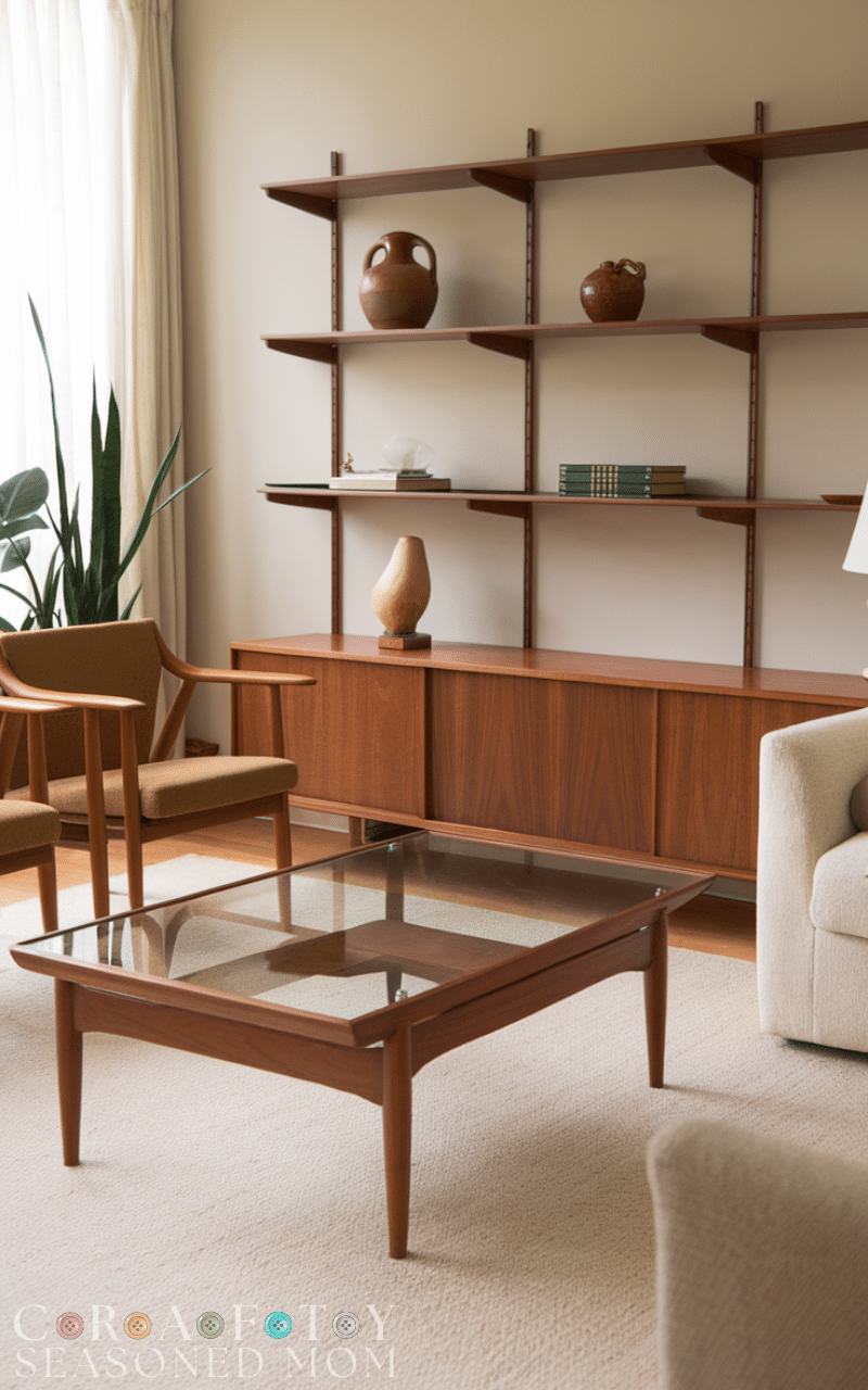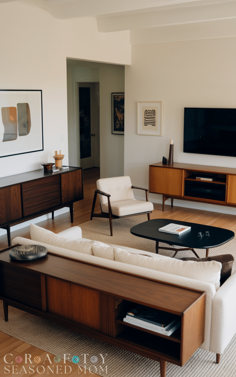 Wood is essential in mid century modern living rooms. Walnut, teak, or oak furniture adds warmth and balance, making the space feel cozy while still maintaining a minimalist aesthetic.