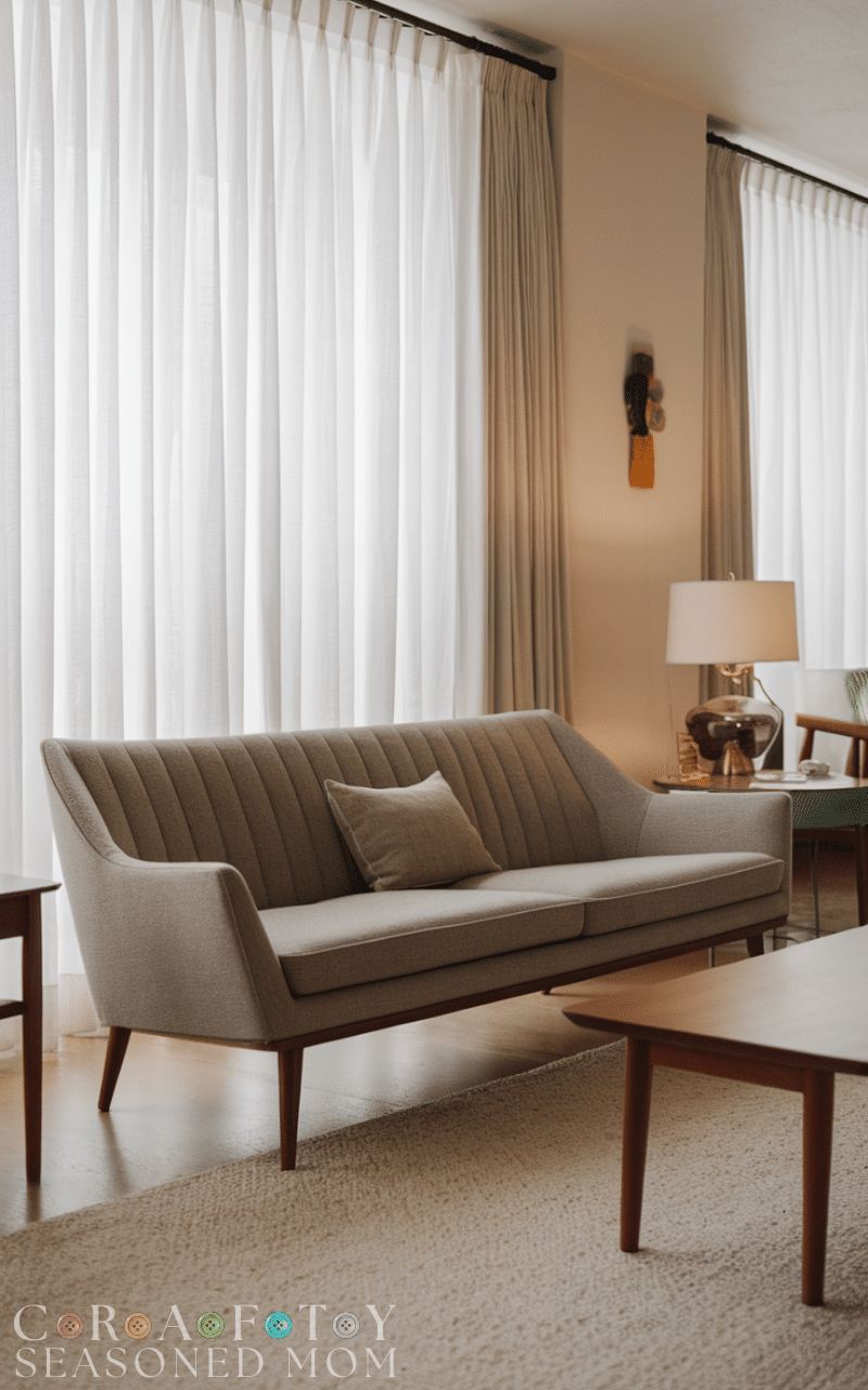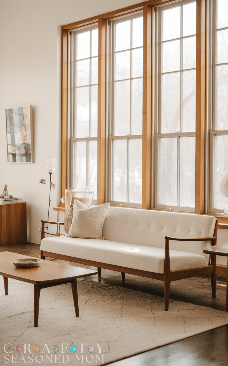 A sleek sofa with tapered wooden legs is the foundation of mid century modern living rooms. Neutral upholstery paired with clean lines keeps the space open and timeless while staying comfortable for everyday living.