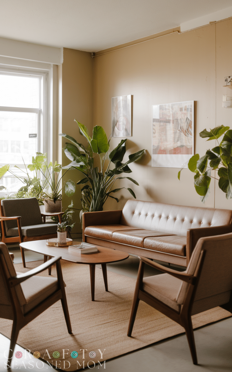 Indoor plants soften the structured lines of mid century modern living rooms. Greenery adds life, freshness, and a natural balance to the overall design.