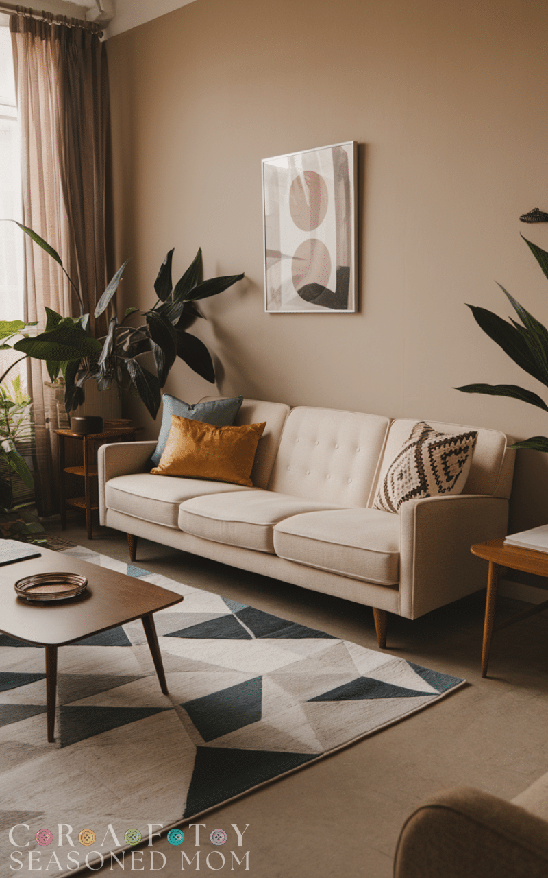 Abstract art or vintage-inspired prints work beautifully in mid century modern living rooms. Art adds personality while respecting the clean and structured design style.