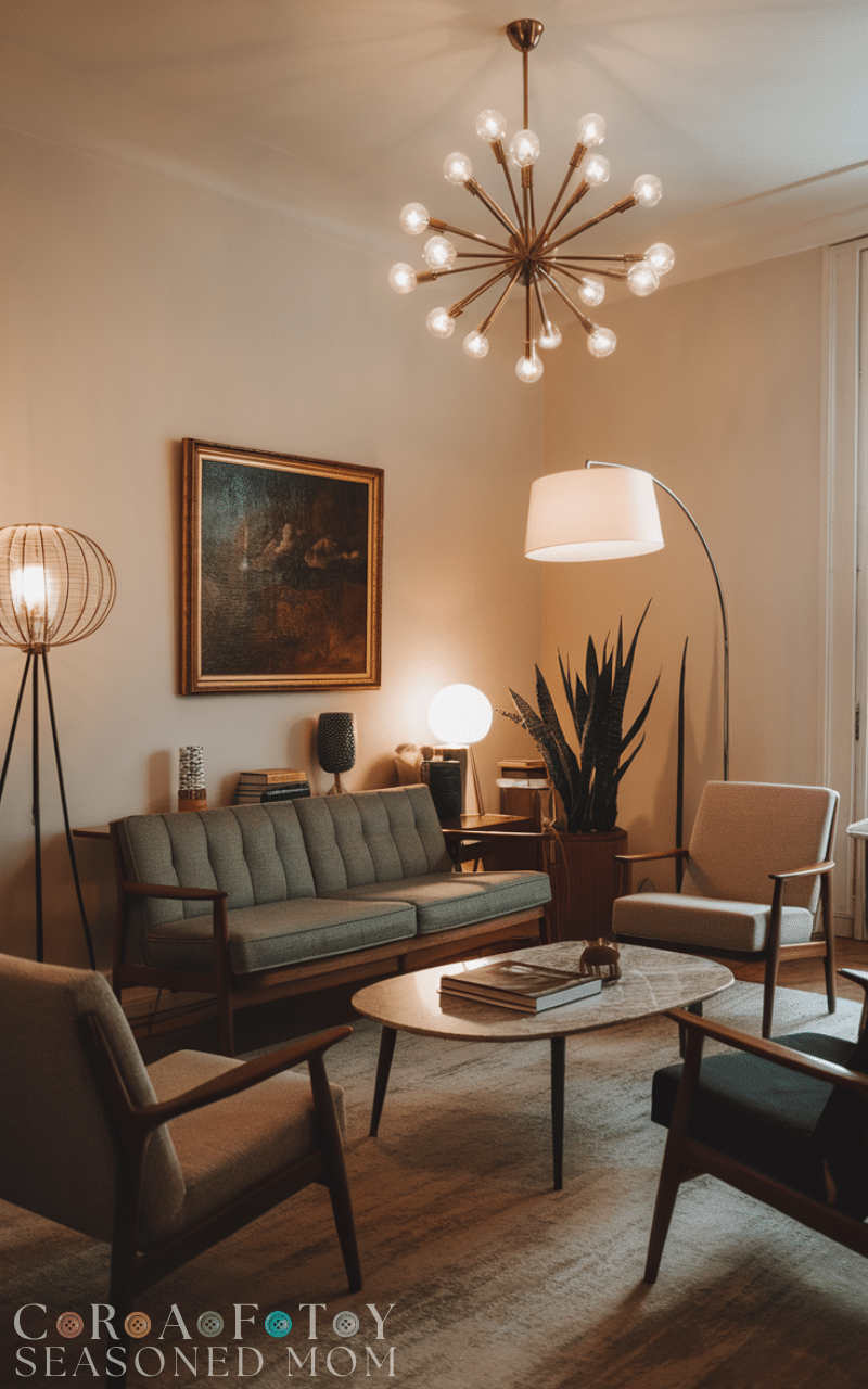 Lighting is a key feature in mid century modern living rooms. Floor lamps, sputnik chandeliers, or arc lamps add character while providing warm, functional lighting.