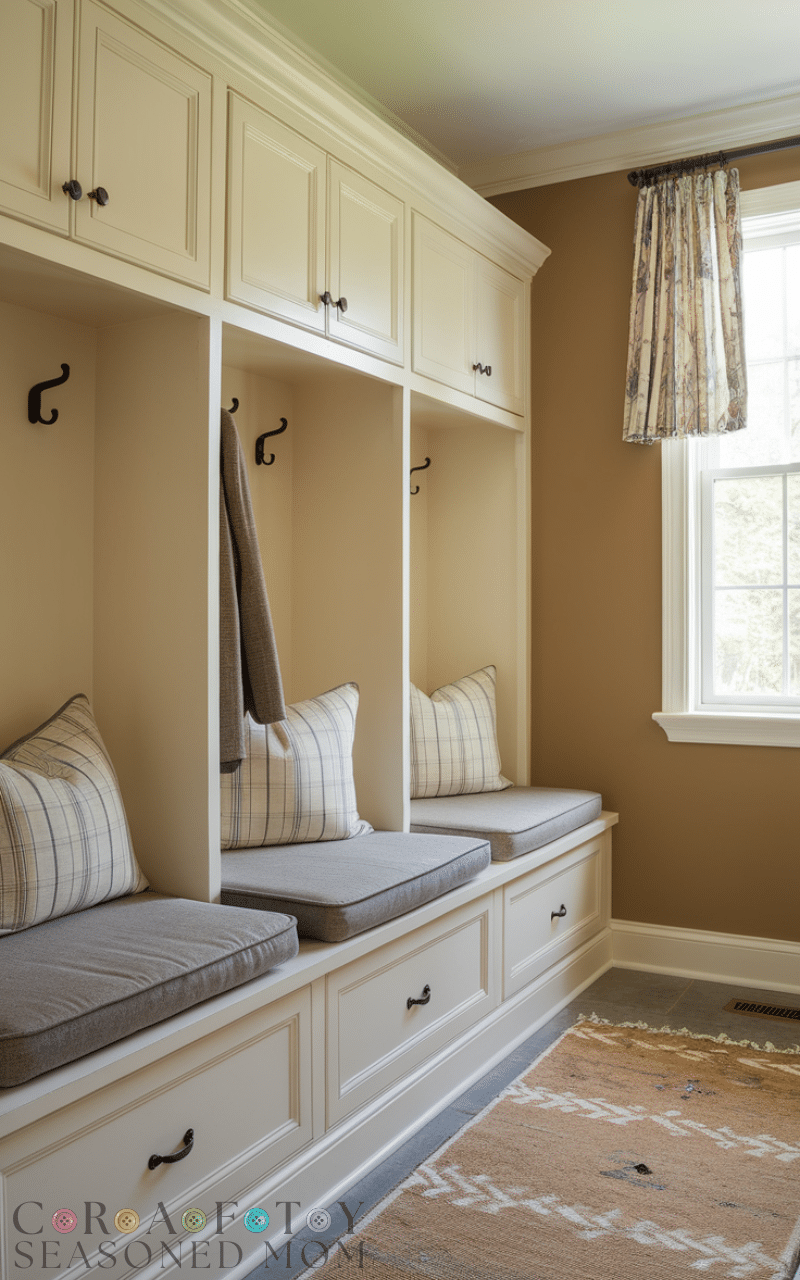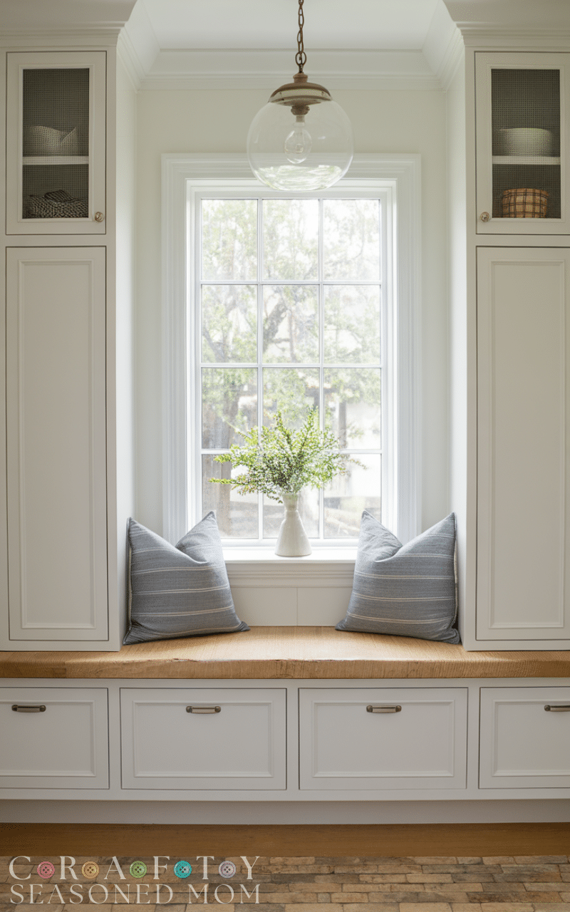Cabinets that frame a window make the entry bright and beautiful and they allow you to use mudroom cabinets for a tidy entry while still keeping the room airy and full of natural light and these cabinets can sit on both sides of the window and offer lots of hidden storage while the light from the window keeps the space cheerful and inviting and this idea works especially well in smaller homes where every bit of brightness matters and using this layout as mudroom cabinets for a tidy entry adds both charm and functionality.