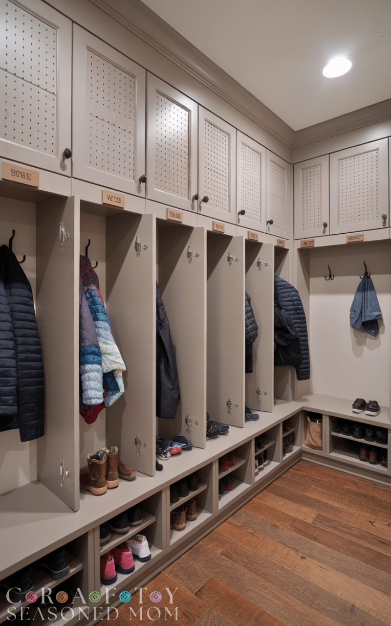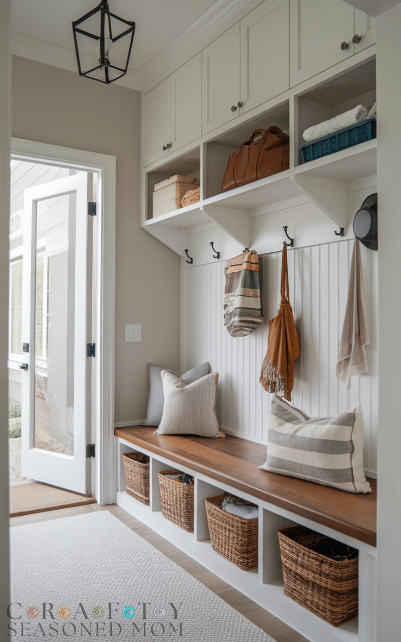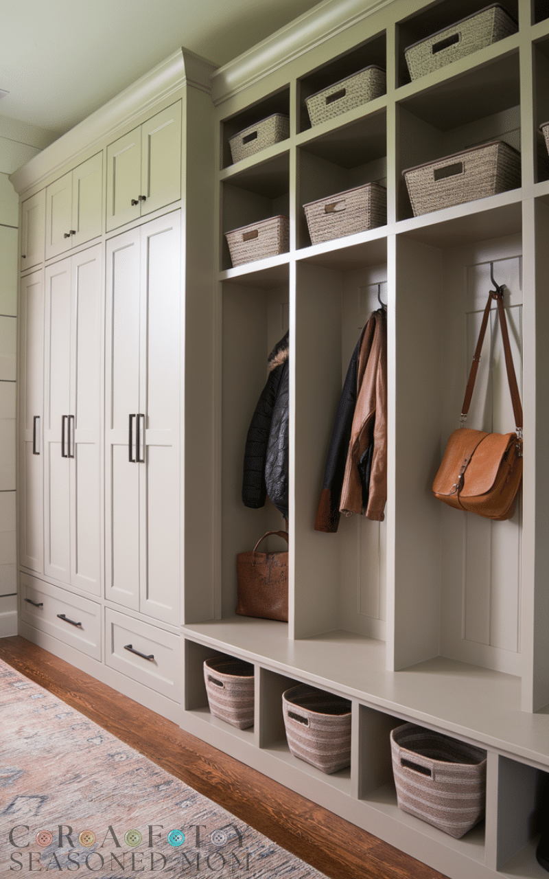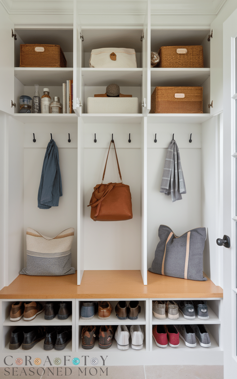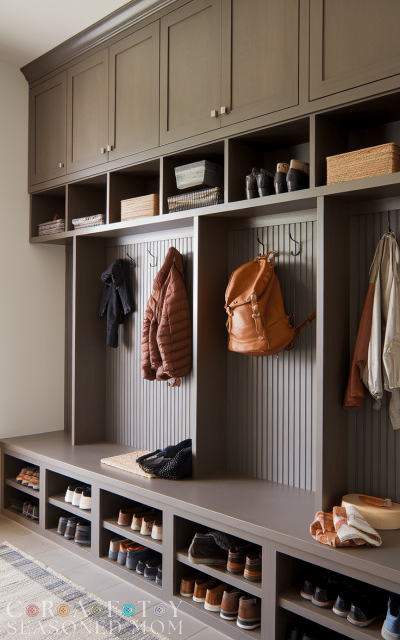 Upper and lower combo cabinets double your storage and they are a smart way to use mudroom cabinets for a tidy entry because they separate daily items from occasional items and the lower section keeps shoes and bags easy to reach and the upper section holds rarely used things and keeps them out of the way and this balance makes the mudroom work smoothly and keeps the entry looking nice and open and using this dual setup as mudroom cabinets for a tidy entry gives you flexibility and a well planned layout that suits any family.