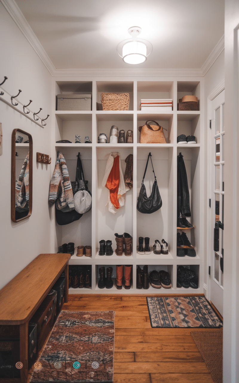 Slim cabinets are amazing for tight spaces and they show that you can still use mudroom cabinets for a tidy entry even in small homes and these cabinets stand tall and narrow and they offer enough room for shoes and jackets without blocking the walkway and this creates a clean and airy look and makes the entry feel bigger and more comfortable and slim designs keep everything tucked away and allow your space to stay simple and clutter free and using slim mudroom cabinets for a tidy entry brings practicality and charm to small hallways.