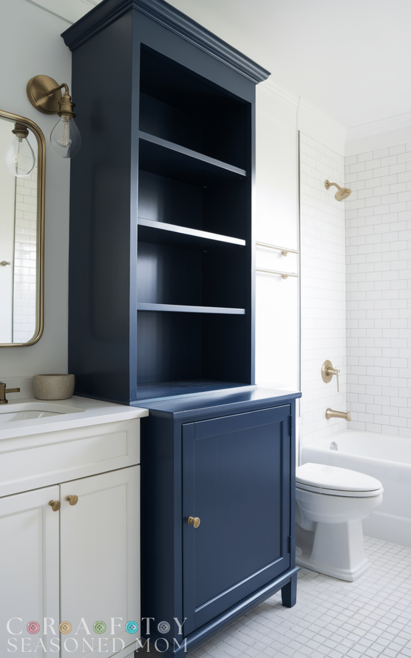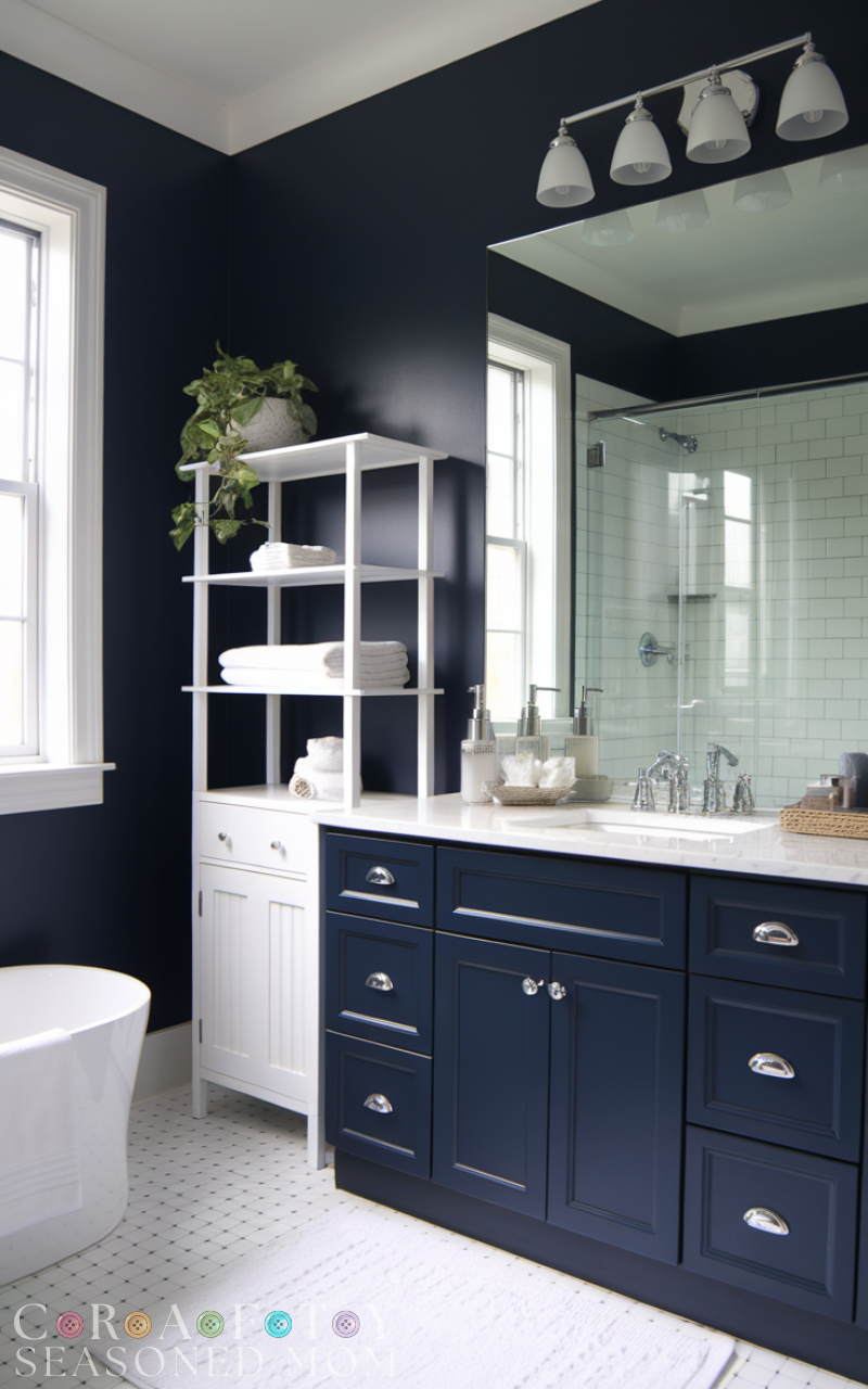 Storage pieces are functional navy blue bathroom decorating ideas. A navy cabinet or shelving unit adds color while keeping the space organized. Choose clean lines and minimal décor to maintain a sleek, uncluttered look.