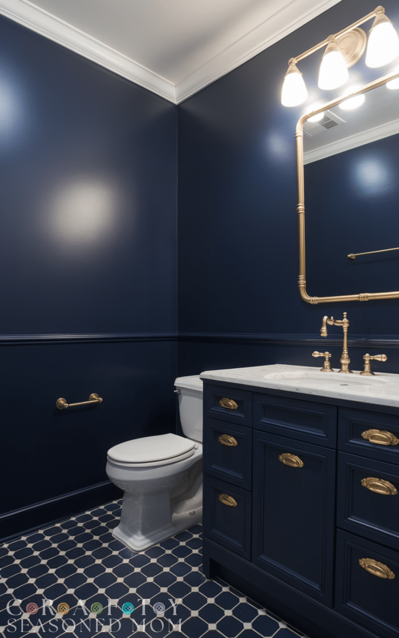 By grounding the room with “marble-look” floor tiles and ensuring every fixture is a deliberate gold statement, you transform a tiny, dark square into a Colonial Revival masterpiece. On a side note, if you’re looking to optimize other spaces in your home, I also have a great article about 14 Best Craft Room Layout Ideas that explores similar spatial challenges!