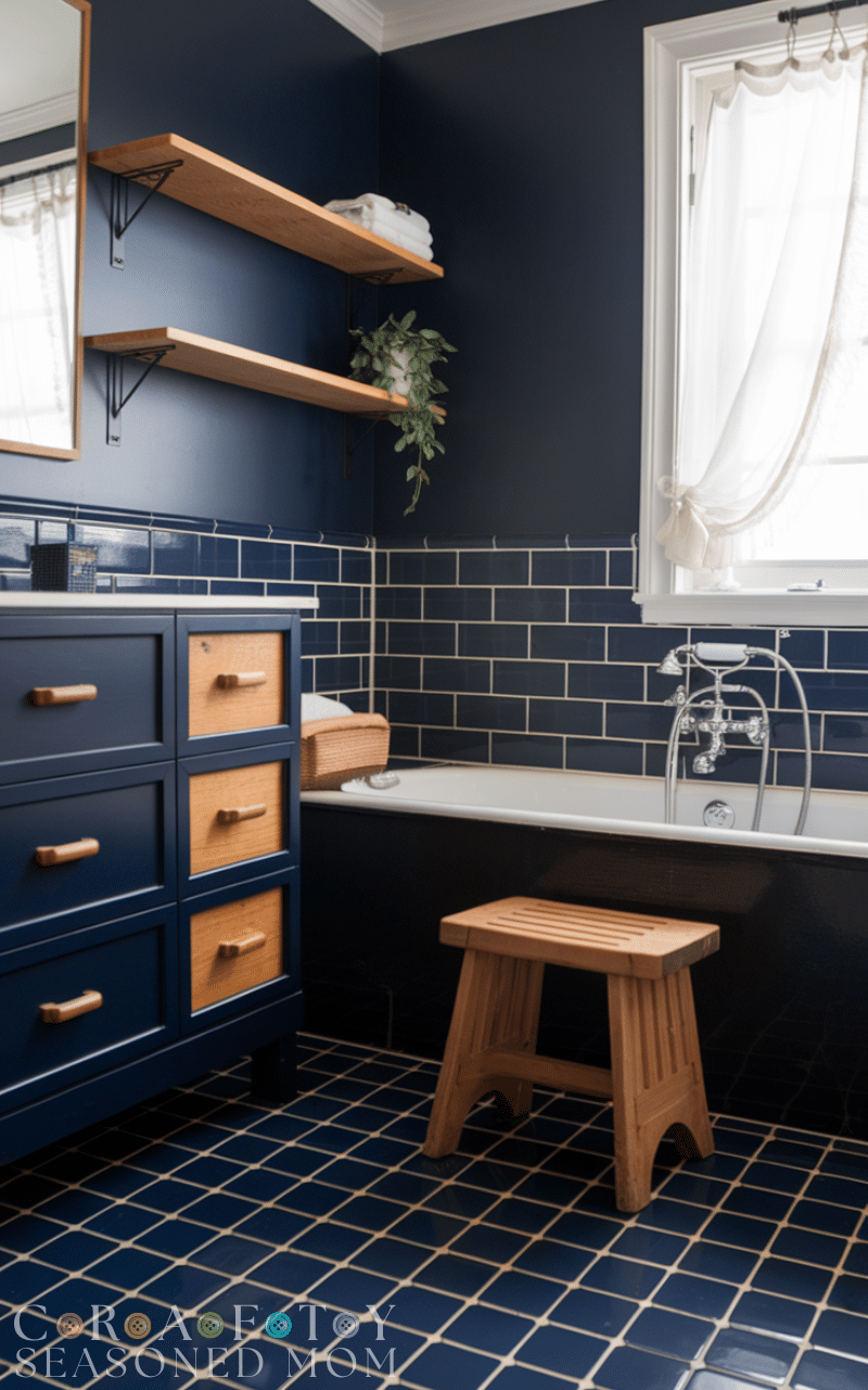 Combining navy blue with warm wood tones is one of the coziest navy blue bathroom decorating ideas. Wooden shelves, vanities, or stools soften the boldness of navy and create a balanced, inviting space. This mix works especially well in modern and coastal bathrooms.