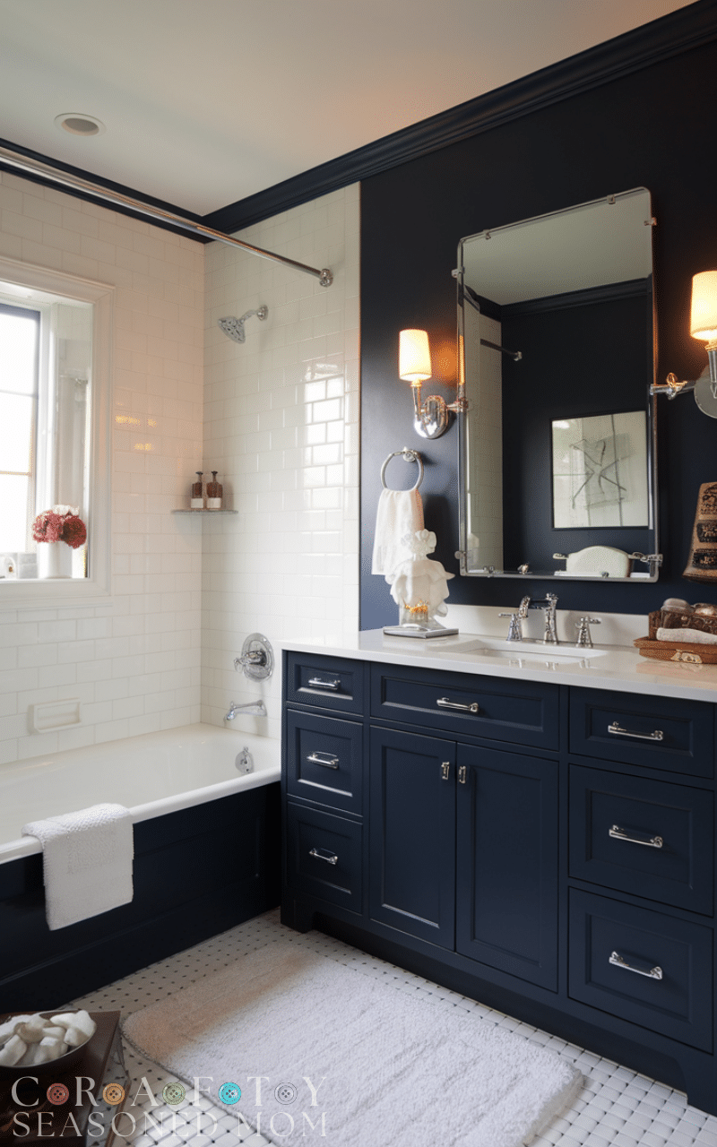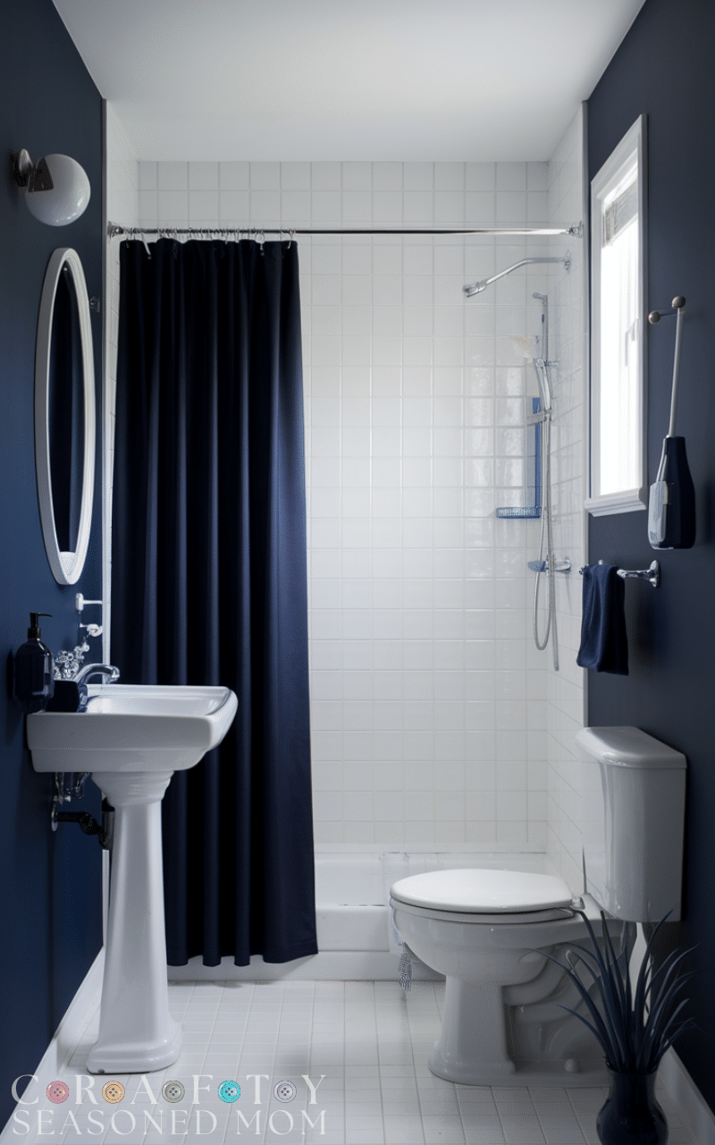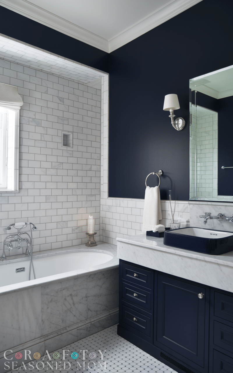 Navy blue walls paired with white accents are timeless navy blue bathroom decorating ideas that instantly feel elegant. The deep blue creates drama while white trims, towels, or fixtures keep the space fresh and balanced. This contrast works beautifully in both small and large bathrooms, making the room feel polished without overwhelming it.
