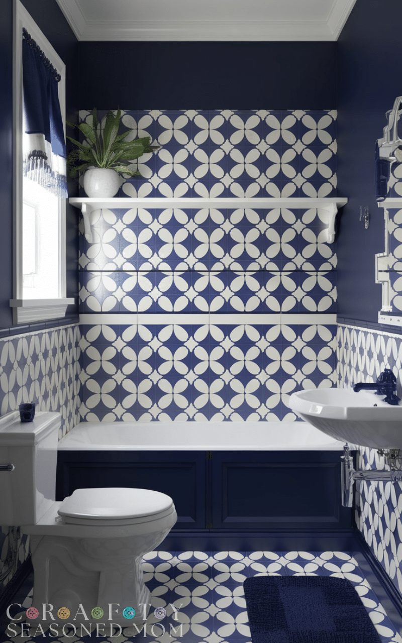 Patterns add character to navy blue bathroom decorating ideas. Think patterned tiles, wallpaper, or rugs with navy tones. Patterns keep the space visually interesting while still feeling cohesive and stylish.