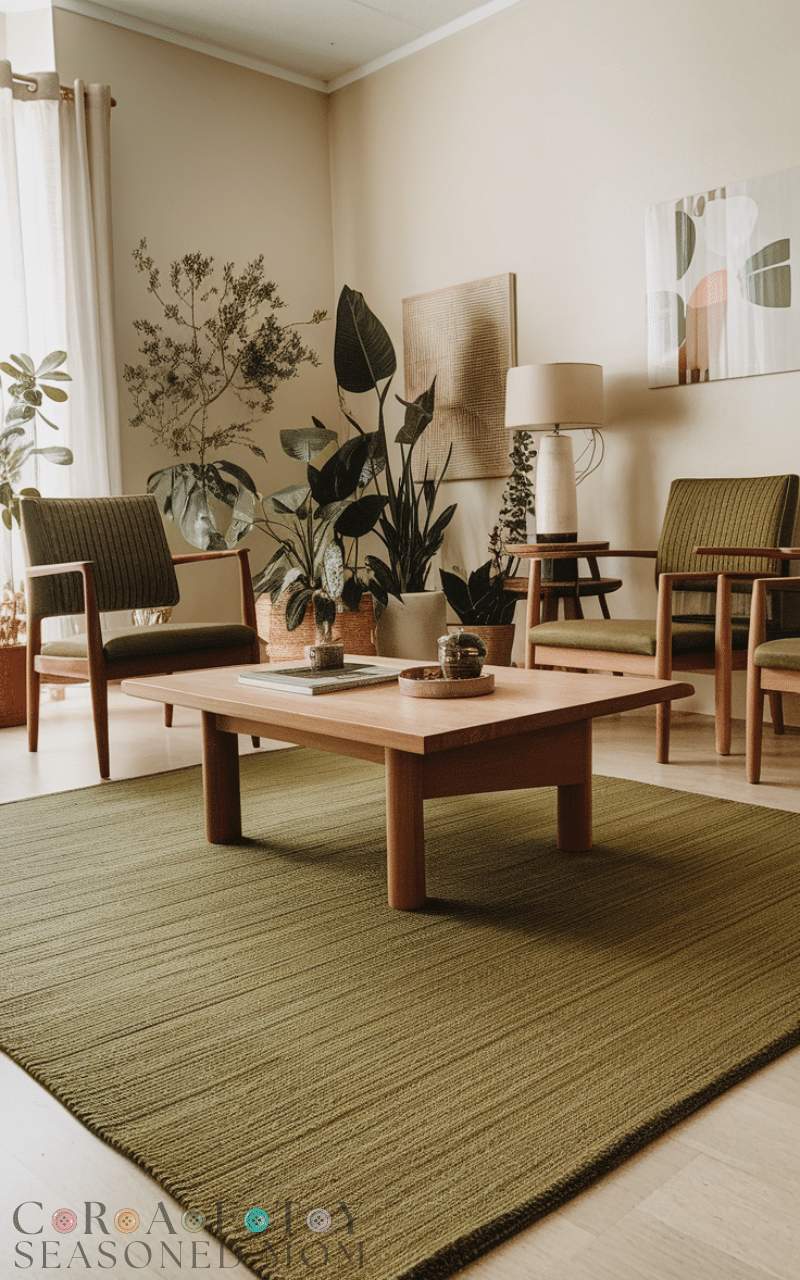 An olive green rug can completely change the feeling of a room because it sets the tone and adds warmth and structure to the space and when you choose a simple pattern or a solid shade the apartment stays open and comfortable and the olive tone blends beautifully with wooden furniture and light walls and this helps highlight the main elements of olive green apartment decor in a soft and natural way and placing the rug in the living room or bedroom makes the space feel grounded and calm and this is especially useful in small apartments where the rug helps define the layout and adds character without clutter.