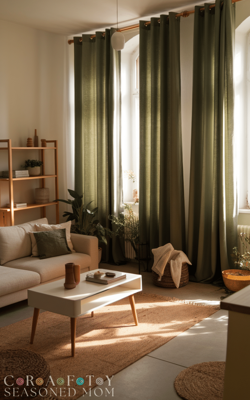 Olive green curtains add elegance softness and warmth to an apartment especially when there is natural light flowing through the space because the light reveals the richness of the shade in a peaceful and cozy way and choosing long lightweight curtains keeps the room bright while still bringing depth and privacy and pairing them with neutral furniture wooden pieces and soft rugs makes the olive green apartment decor more visible and more balanced and when the curtains move gently with airflow the room gains a relaxing natural feeling and this simple change can transform a basic apartment into a calm and stylish environment without needing any major updates.