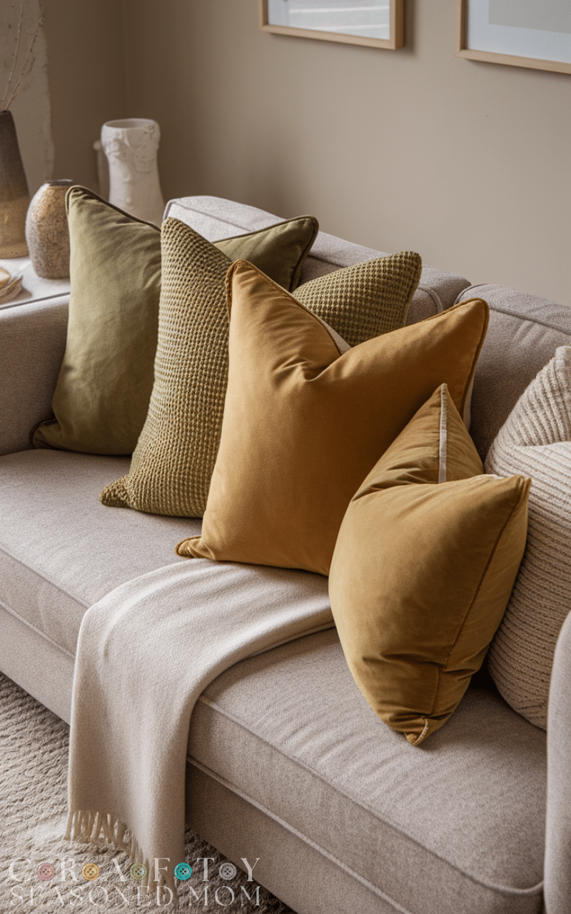 Throw pillows are the easiest way to bring olive green apartment decor into your home because they require no effort and instantly refresh the look of your living room or bedroom and choosing pillows in different textures like velvet cotton or knitted fabrics creates a warm layered look and mixing various sizes gives a natural balance that feels comfortable and welcoming and pairing the pillows with a light neutral blanket helps the olive tones stand out more and this creates harmony in the space without too many changes and this idea works perfectly for renters students or anyone who wants a soft and quick upgrade and with these pillows the apartment feels warmer fresher and full of personality.