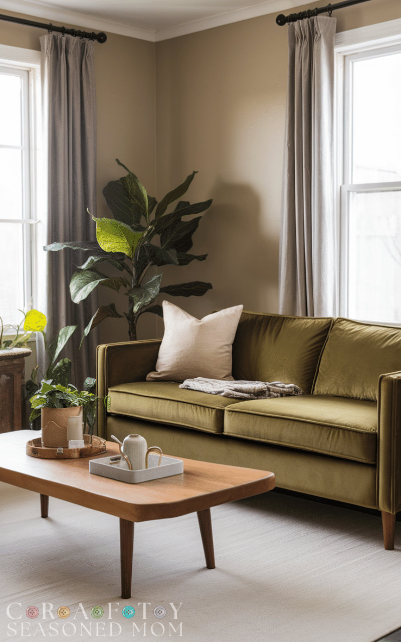 An olive green velvet sofa brings elegance comfort and softness to any small or large apartment and it instantly elevates the atmosphere while staying warm and welcoming and the velvet texture reflects light beautifully so the sofa becomes a statement piece without overpowering the rest of the space and when you pair it with light rugs simple curtains and soft throw pillows you create the perfect balance that highlights the beauty of olive green apartment decor and this sofa works especially well in small apartments because it adds richness without making the area feel crowded and mixing wood elements and neutral tones around it makes the sofa shine even more and this transforms your living room into a cozy stylish and modern space that feels both relaxing and luxurious.