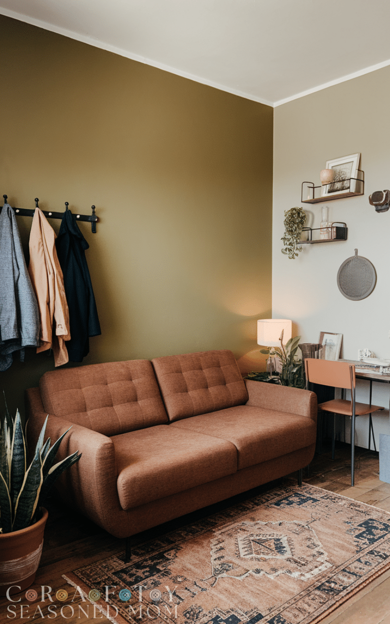 When you want to bring olive green apartment decor into your space one of the easiest ways is creating an accent wall in this warm natural shade and this idea works beautifully because the color adds depth and calm energy while keeping the apartment feeling cozy and balanced and when you choose only one wall to paint you make the space feel stylish without making it look dark and choosing the wall behind your sofa or bed creates a soft focal point that pulls the room together and you can keep the rest of the decor neutral so the olive tone stands out gently and this also makes the apartment feel more modern and organized and when you mix the accent wall with simple furniture the space instantly looks designer inspired and that is why an olive green wall is a powerful way to start your olive green apartment decor transformation in a simple and effective way.
