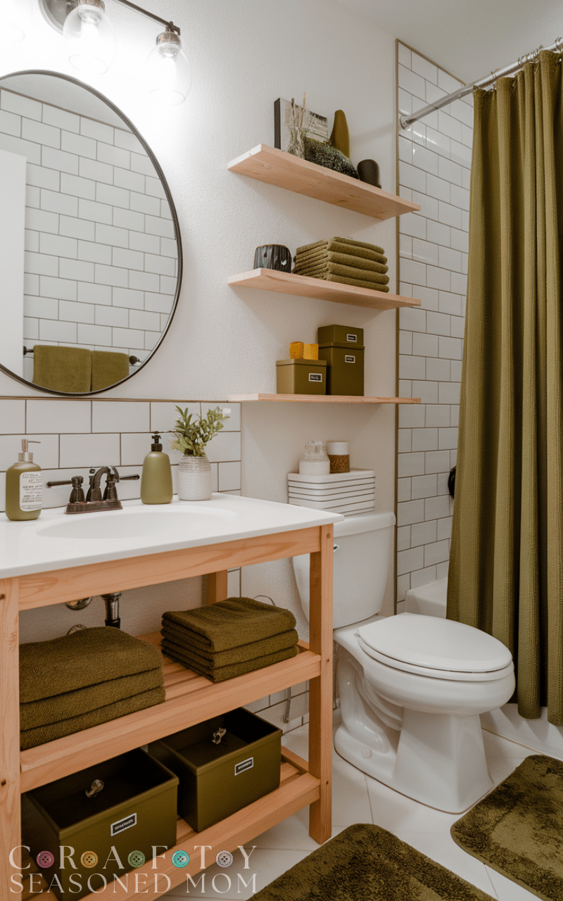 Bathroom accessories in olive green such as towels soap dispensers storage containers or shower curtains can transform the space instantly because the color adds richness and makes the bathroom feel calm and organized and mixing these pieces with white tiles natural wood or beige decor helps highlight your olive green apartment decor theme and this change is simple quick and perfect for anyone who wants to refresh the bathroom without a big renovation.