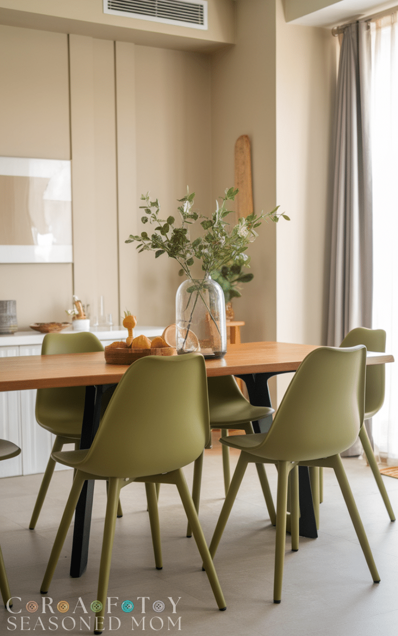 Olive green dining chairs give your dining area a stylish contemporary look while keeping the space warm and inviting and the color blends beautifully with wooden dining tables and neutral walls making olive green apartment decor feel complete and visually appealing and this idea works for small apartments because the chairs add character without overwhelming the room and they also create a comfortable and welcoming place for meals and gatherings.