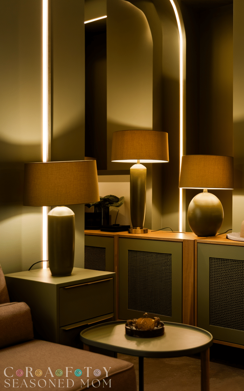 Lamps with olive green shades or bases create warm lighting and add an artistic touch to the space and when you pair them with natural wood or gold accents the result becomes elegant and modern and this type of lighting supports olive green apartment decor by highlighting textures colors and corners in a subtle and peaceful way and placing the lamp on a nightstand a side table or a console instantly upgrades the room and adds charm.