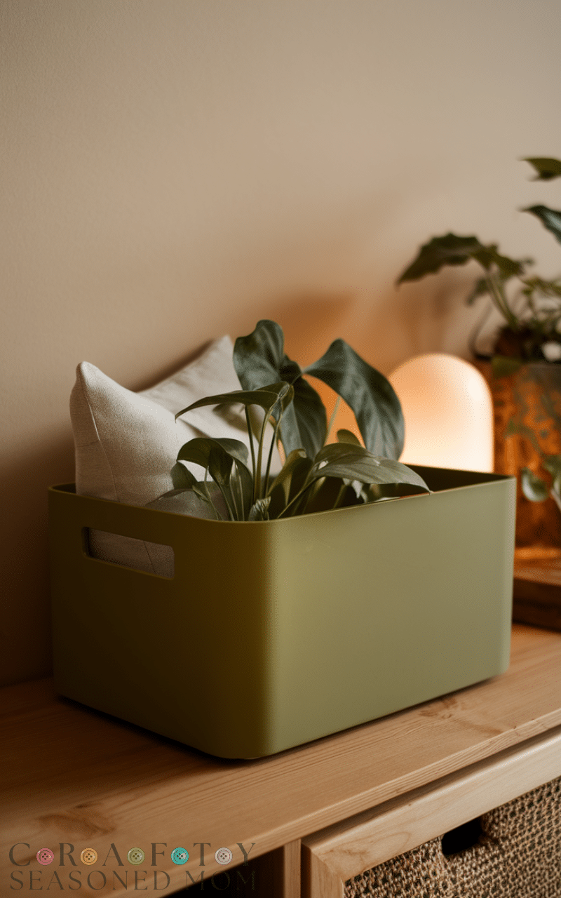 Olive green storage baskets are both practical and stylish because they help keep the apartment organized while also adding a soft decorative touch that fits perfectly with olive green apartment decor and placing these baskets under tables on shelves or inside closets keeps the space tidy and visually calming and the color blends nicely with natural wood tones and beige elements and this makes the apartment look coordinated and intentional without requiring much effort.