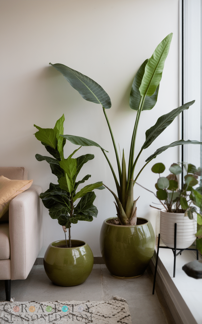 Plants always bring life into an apartment and choosing olive green pots creates a natural blend that strengthens your olive green apartment decor theme and placing large leafy plants in corners or next to furniture helps fill empty spaces in a fresh and stylish way and the combination of deep green leaves with softer olive pots builds a soothing natural environment that feels organized uplifting and welcoming and this idea works perfectly for living rooms bedrooms and even small balconies.