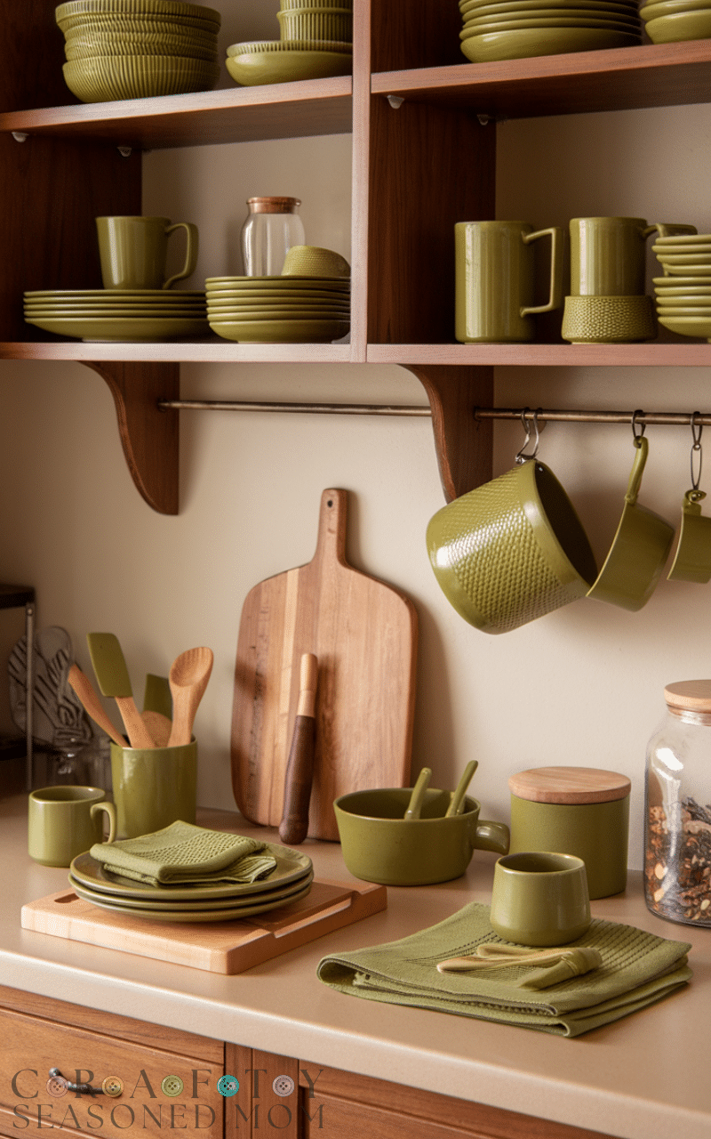 You can bring olive green apartment decor into your kitchen without replacing cabinets simply by adding small accessories like mugs plates towels cooking tools or storage jars in olive tones and these small touches make the kitchen look coordinated fresh and full of personality and combining the olive items with wood bamboo or glass keeps the design airy and natural and this makes the kitchen feel brighter and cleaner and since accessories are easy to change you can update the style whenever you want in a simple flexible way.