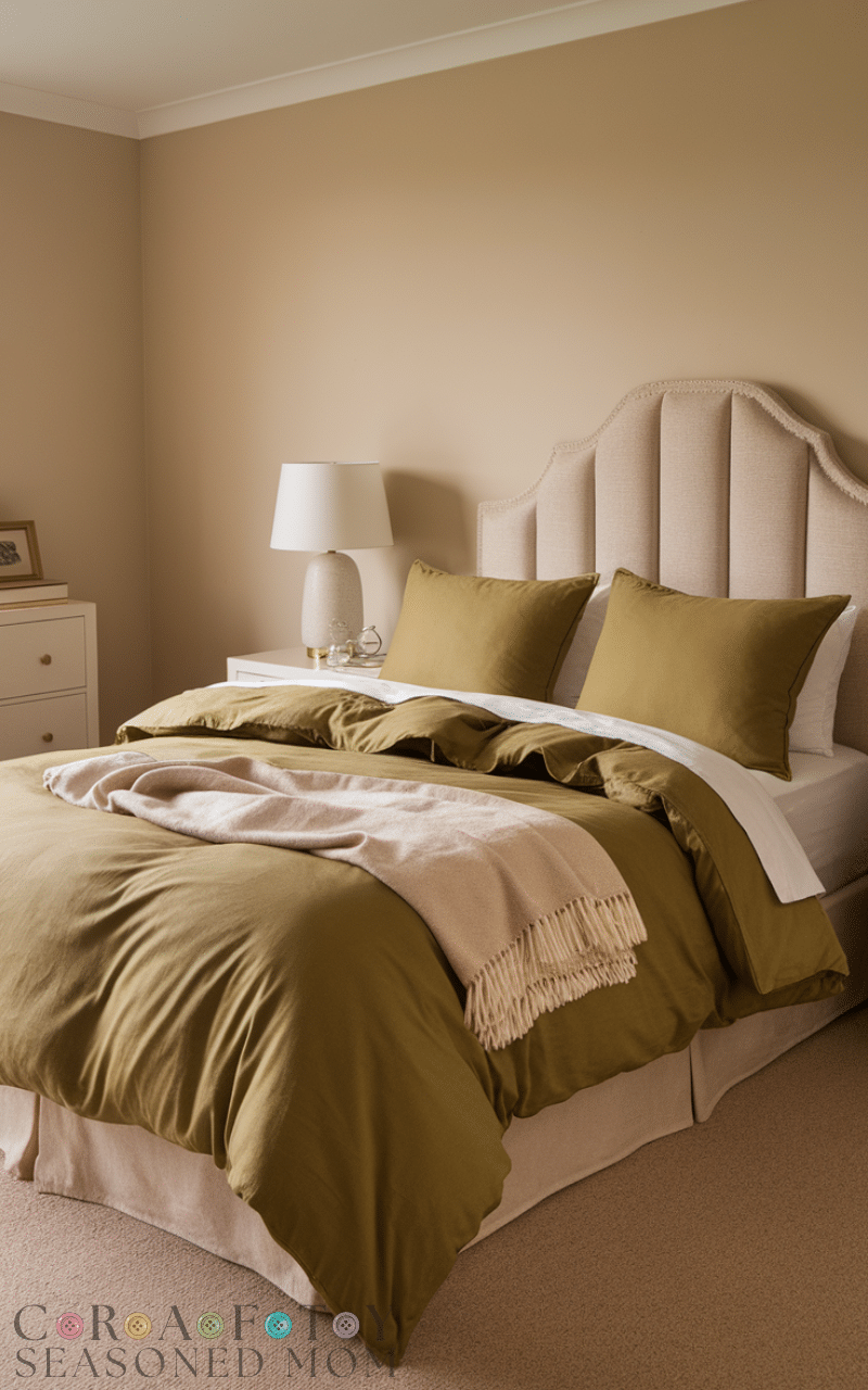 Olive green bedding brings a peaceful and relaxing energy to your bedroom because the shade creates a natural and calming atmosphere perfect for rest and comfort and choosing soft cotton or smooth textured bedding makes the room feel warm and welcoming and pairing it with neutral pillows or a beige throw blanket builds a harmonious and elegant look that supports the whole idea of olive green apartment decor and this small change makes the bedroom feel styled and organized and it is a great choice for anyone who wants a refreshing update without doing too much work.