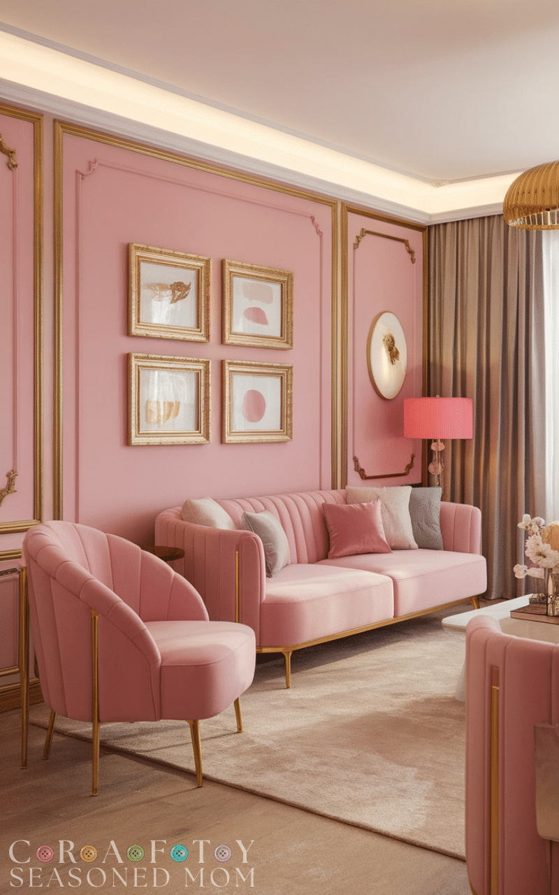 Gold frames, mirrors, or lighting fixtures look beautiful against the pink background. Neutral furniture keeps the space balanced while allowing the wall to shine as a centerpiece.
