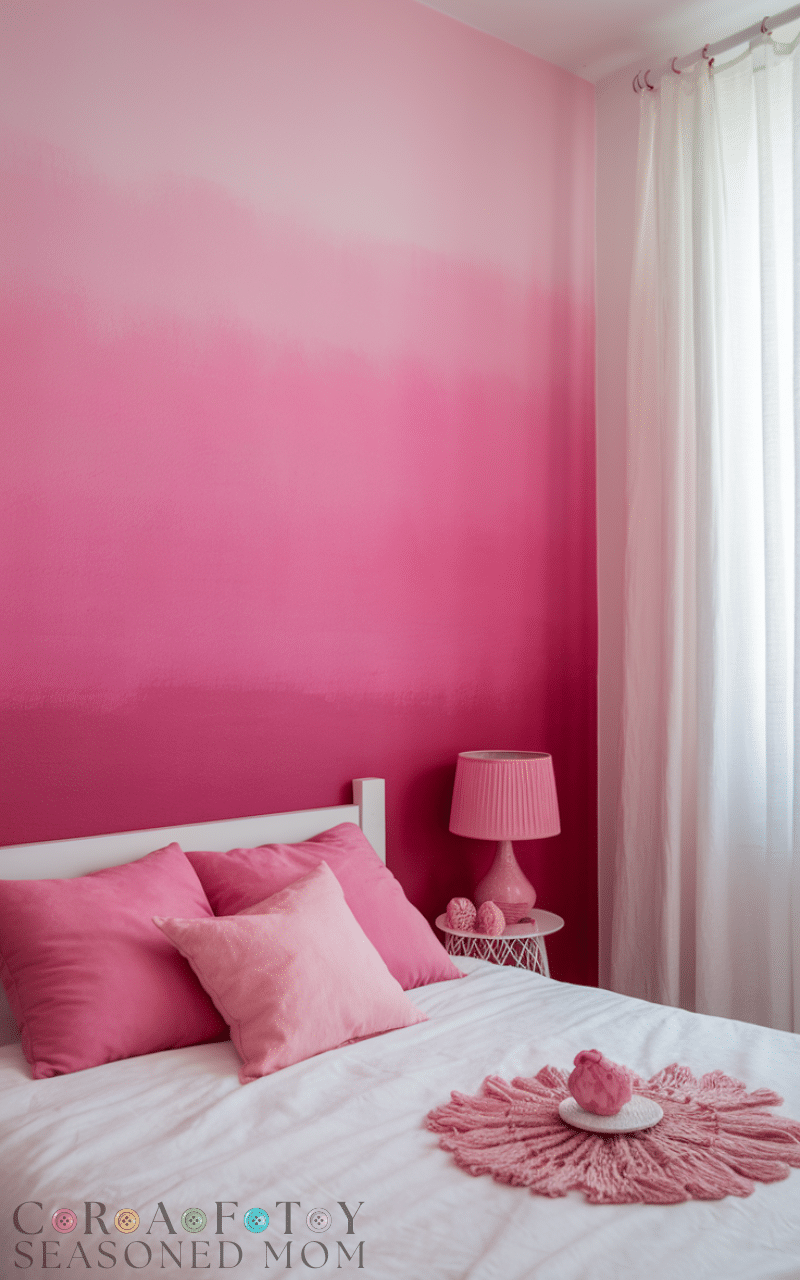 An ombre design gradually blending from light pink to deeper shades creates a stunning visual effect. The soft color transition adds movement and depth to the wall, making it feel artistic and unique.