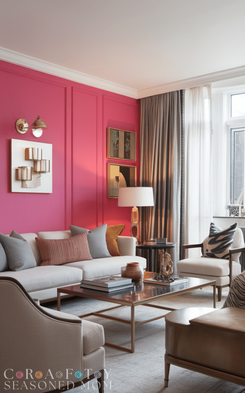 If you love dramatic interiors, a bold hot pink feature wall can instantly energize a room. This vibrant shade becomes the main focal point and works especially well in creative spaces, living rooms, or modern apartments.