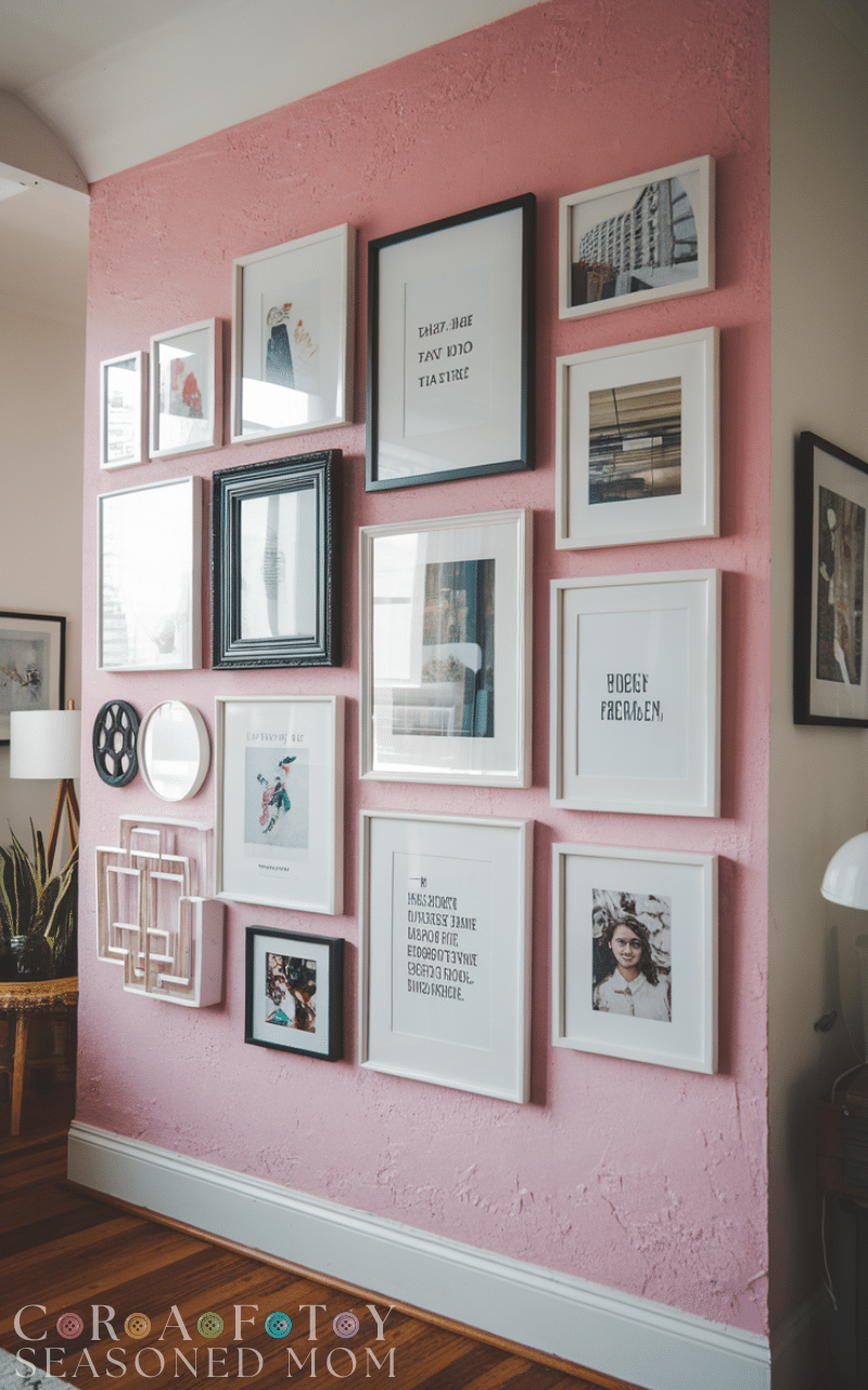 A gallery wall placed against a pink background adds personality and creativity to any room. Photos, artwork, or inspirational quotes become the main decorative feature.