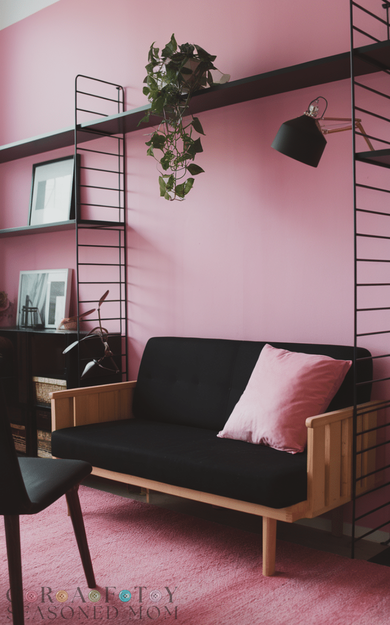 This design works particularly well in contemporary living rooms or studio spaces. The darker accents balance the softness of pink while adding dramatic visual contrast.