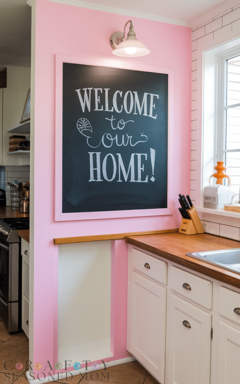 A chalkboard wall painted in pink is both decorative and functional. It allows you to write notes, draw designs, or display inspirational quotes.